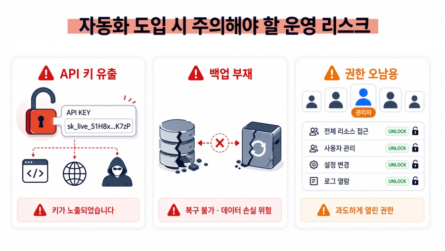 자동화는 반복 업무를 대신 처리해 주는 든든한 도구입니다. 하지만 관리가 허술하면 오히려 보안 사고나 데이터 손실의 원인이 되기도 해요. 현장에서 흔히 마주치는 사고 유형은 다음과 같습니다.