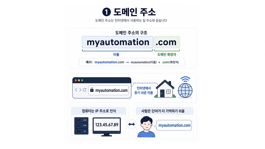 도메인 주소는 인터넷에서 사용하는 집 주소와 같습니다. 컴퓨터끼리는 서로를 "123.45.67.89" 같은 IP 주소로 인식하지만, 사람이 기억하기엔 숫자보다 단어가 훨씬 편하죠. 그래서 "myautomation.com" 같은 이름을 사용합니다.