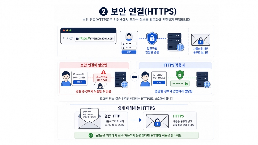 편지를 보낼 때 봉투에 자물쇠를 채워 보내는 것과 비슷하다고 생각하면 이해가 쉽습니다. n8n을 외부에서 접속 가능하게 운영한다면 HTTPS 적용은 필수예요.