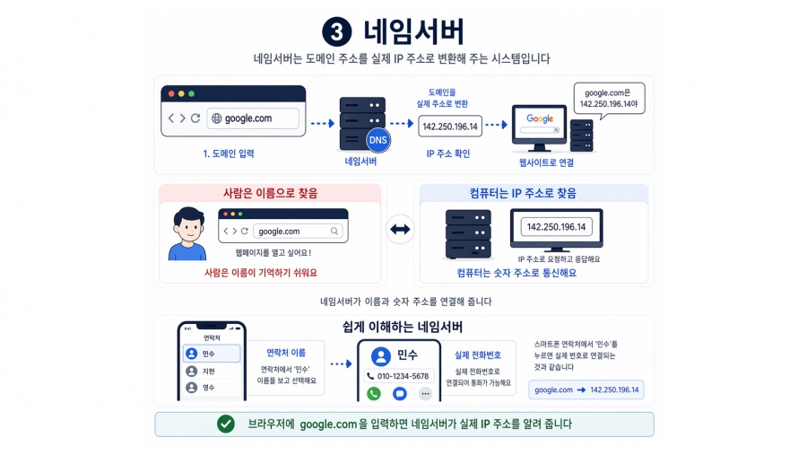 사용자가 브라우저에 "google.com"을 입력하면, 네임서버가 "그건 142.250.196.14번 컴퓨터야"라고 알려 주는 구조입니다.