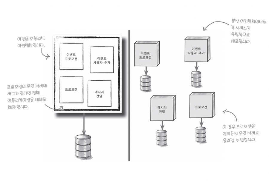 하나의 예로, 프로모션 기능을 가진 애플리케이션을 생각해볼 수 있습니다. 이를 모놀리식(monolithic) 아키텍처로 설계하면 전체 애플리케이션이 하나의 단위로 빌드되고 배포되므로, 일부 기능이 변경되더라도 전체를 다시 배포해야 합니다. 반면, 분산(distributed) 아키텍처로 설계하면 프로모션 서비스만 독립적으로 재배포할 수 있습니다.
