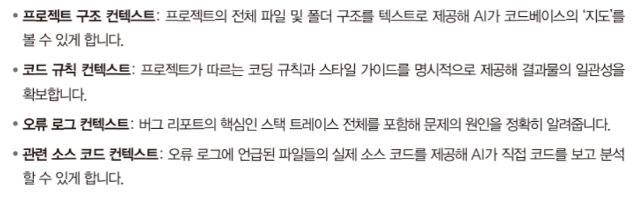 에이전트에게 일을 시키기 전, 우리 팀의 코드 스타일, 프로젝트 폴더 구조, 최근 발생한 에러 로그, 기존 코드 스니펫 등을 한데 묶어 전달합니다. 이는 단순한 프롬프트가 아니라 AI를 위한 온보딩 과정과 같습니다. 이렇게 ‘온보딩’된 AI 주니어 개발자는 프로젝트의 맥락을 이해하고, 팀의 규칙에 맞는 결과를 만들어냅니다. 이제는 “왜 이런 코드가 나왔지?”라고 수정하는 대신, 바로 사용할 수 있는 결과를 받게 됩니다.