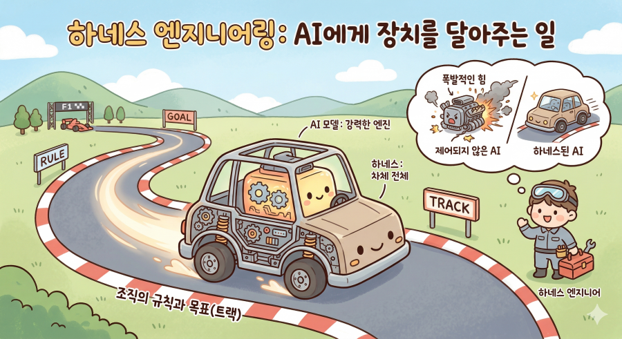 엔진이 아무리 강력해도 차체와 서스펜션, 브레이크 시스템이 뒷받침되지 않으면 경주 자체가 불가능합니다. 트랙을 벗어나거나 코너에서 전복될 것이 뻔하기 때문입니다. 여기서 AI 모델이 ‘엔진’이라면, 하네스는 그 엔진을 감싸는 ‘차체 전체’입니다. 엔진의 폭발적인 힘을 100% 발휘하되, 차를 트랙 위에 머물게 해주는 것. 그것이 하네스 엔지니어링의 본질입니다.