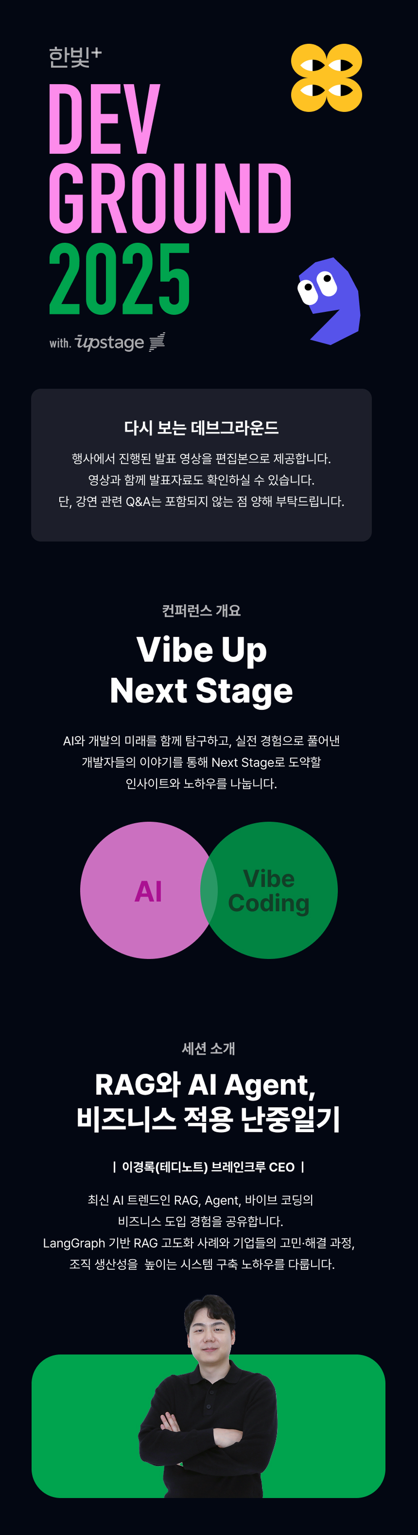 최신 AI 트렌드인 RAG, Agent, 바이브 코딩의 비즈니스 도입 경험을 공유합니다.