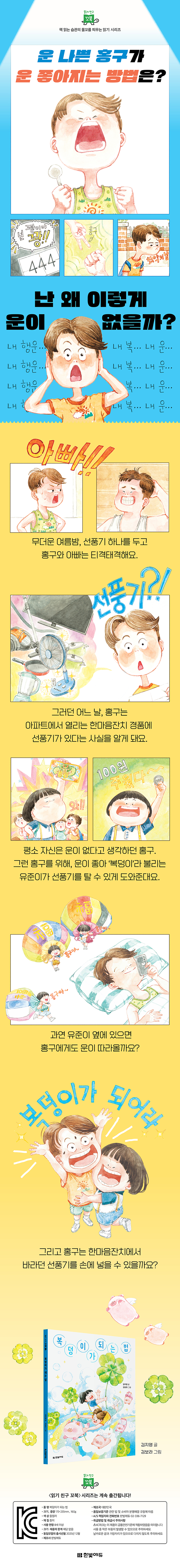 “아빠, 나도 덥다고!” 무더운 여름밤, 선풍기 하나를 두고 홍구와 아빠는 티격태격합니다. 그러던 어느 날 아파트에서 한마음잔치 소식과 함께 경품권을 받으라는 방송이 들려옵니다. 홍구는 경품권을 뽑으러 갔다가 운이 좋기로 소문난 ‘복덩이’ 유준이를 만나게 되지요. 경품 목록에 선풍기가 있다는 말을 들은 뒤, 홍구는 새 선풍기를 더욱 간절히 바라게 됩니다. 복덩이 유준이는 홍구가 선풍기를 받도록 도와주겠다고 합니다. 과연 유준이 옆에 있으면 홍구도 복이 따라올까요? 그리고 홍구는 한마음잔치에서 바라던 선풍기를 손에 넣을 수 있을까요?