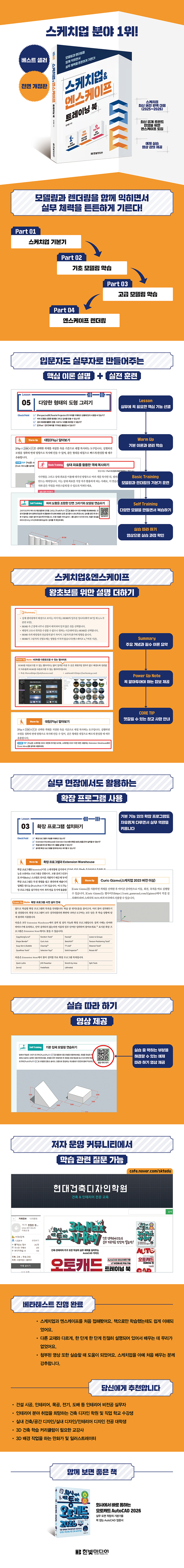 기본기를 튼튼하게 쌓고 모델링과 렌더링을 반복 훈련하면서 무엇이든 만들 수 있는 스케치업 사용자로 거듭날 수 있다. 최신 버전으로 업데이트된 스케치업과 엔스케이프에 완벽히 대응하였다.