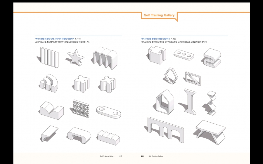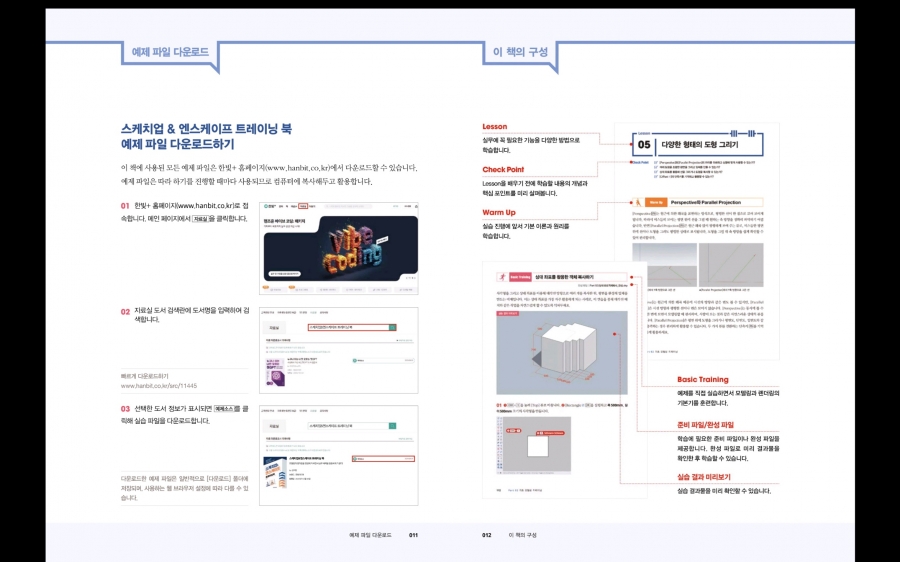이 책은 Warm up, Basic Training, Self Training으로 구성하여 Warm up에서는 간단한 개념 설명을 하고 Basic Training에서 예시를 단계별로 실습해보고 마지막 Self Training에서는 결과물을 보여주고 직접 할 수 있게 해두었다.
