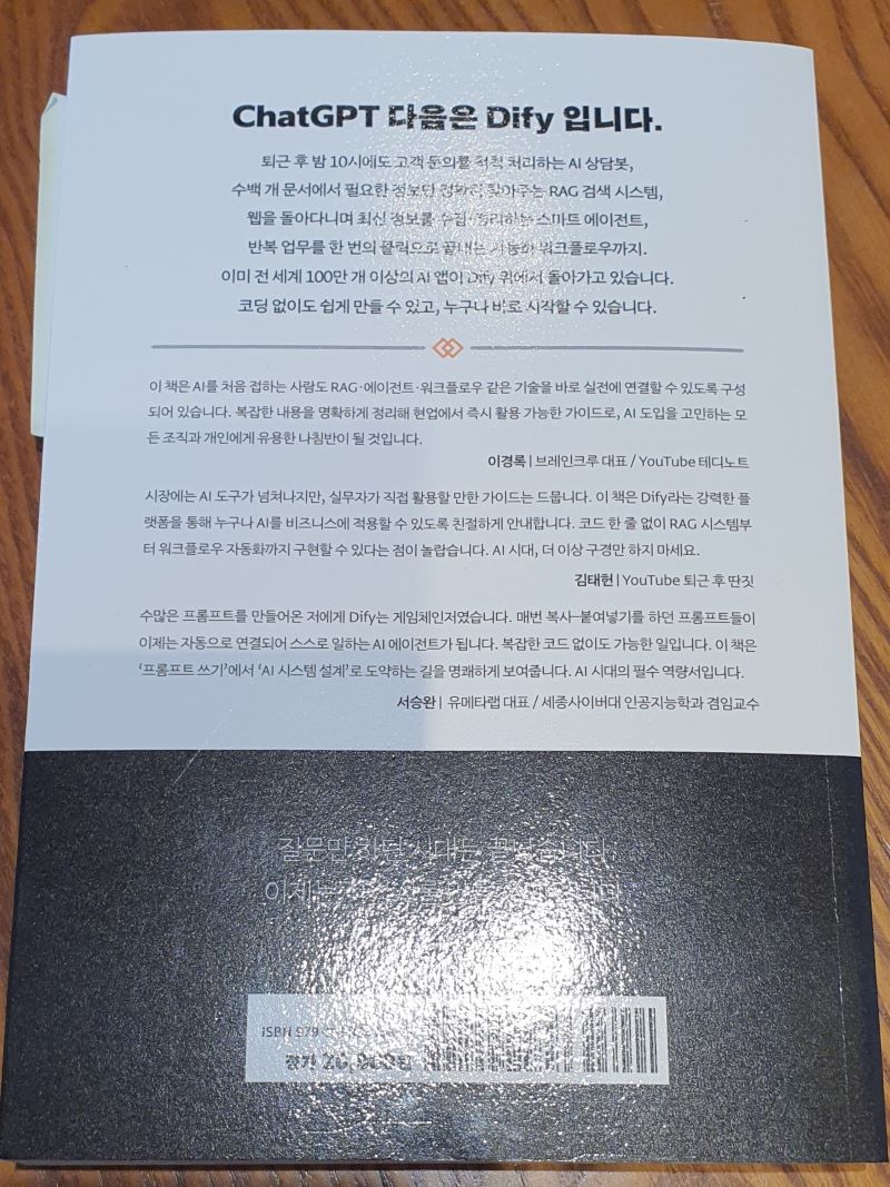 "드래그 앤 드롭만으로 AI 서비스를 만든다?" Dify 플랫폼으로 고객 상담 챗봇은 물론, 문서 학습 AI, 실시간 웹 검색 에이전트, 자동화 프로세스까지 코딩 한 줄 없이 설계·배포가 가능하다는 점을 알려 주고 있다. 이 책의 가장 큰 매력이다. ㅋㅋ