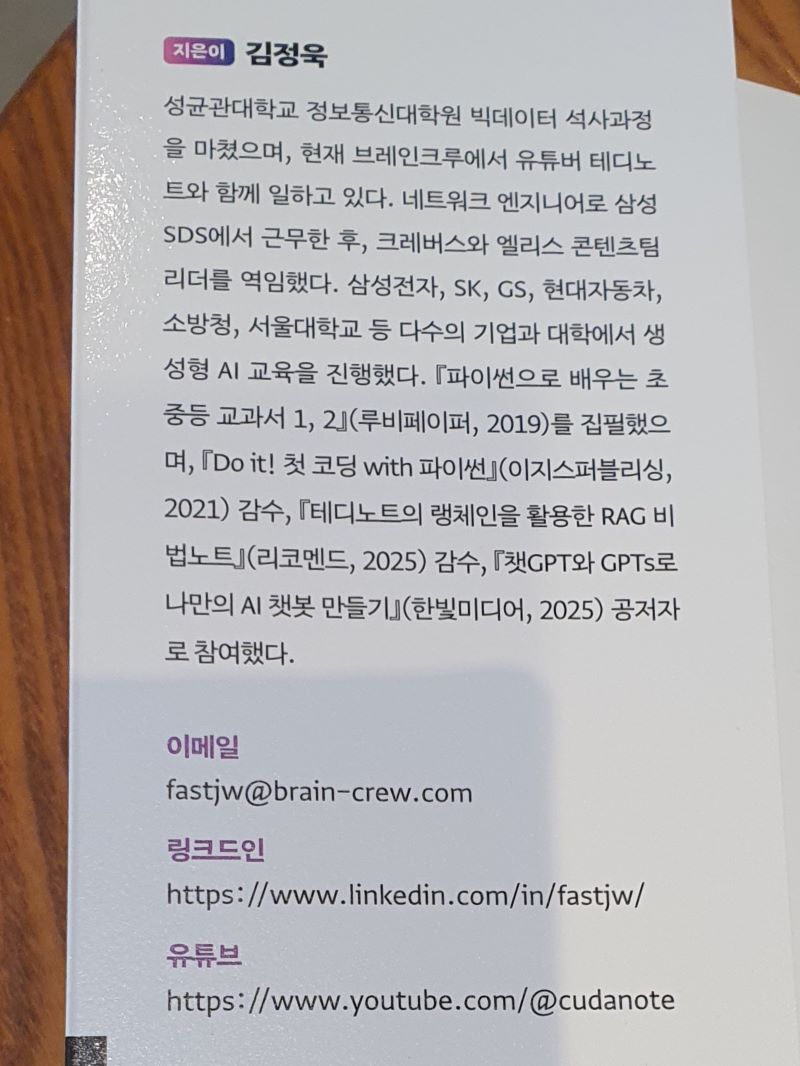 성균관대학교 정보통신대학원 빅데이터 석사과정을 마쳤으며, 현재 브레인크루에서 유튜버 테디노트와 함께 일하고 있다. 네트워크 엔지니어로 삼성SDS에서 근무한 후, 크레버스와 엘리스 콘텐츠팀 리더를 역임했다. 삼성전자, SK, GS, 현대자동차, 소방청, 서울대학교 등 다수의 기업과 대학에서 생성형 AI 교육을 진행했다. 『파이썬으로 배우는 초중등 교과서 1, 2』(루비페이퍼, 2019)를 집필했으며, 『Do it! 첫 코딩 with 파이썬』(이지스퍼블리싱, 2021) 감수, 『테디노트의 랭체인을 활용한 RAG 비법노트』(리코멘드, 2025) 감수, 『일잘러의 비밀, 챗GPT와 GPTs로 나만의 AI 챗봇 만들기』(한빛미디어, 2025) 공저자로 참여했다.