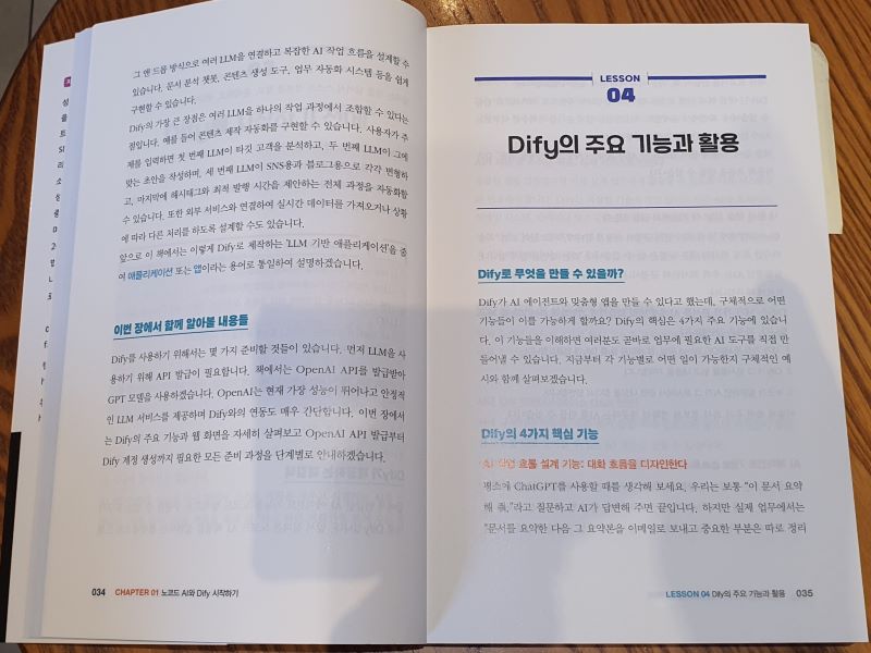 그러던 중 온라인 커뮤니티에서 Dify라는 노코드 AI 플랫폼 이야기를 접했습니다. 코딩 없이 드래그 앤 드롭만으로 AI 앱을 만들 수 있다는 게 믿기지 않았지만, 이미 100만 개 이상의 AI 앱이 운영되고 있다는 점에서 검증된 도구라는 확신이 들었습니다. 마침 이 책이 국내 첫 Dify 가이드북이라는 점, 그리고 실전 프로젝트 파일과 노션 워크스페이스까지 제공한다는 점에서 망설임 없이 구매했습니다. IT 업계에 있으면서도 개발은 아닌 직군이라, 이런 노코드 도구가 정말 필요했거든요.