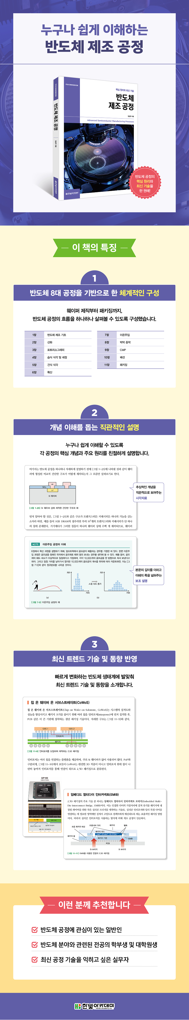 이 책은 반도체 분야와 관련된 학부생 및 대학원생, 산업체 엔지니어,그리고 반도체 제조 공정에 관심이 있는 독자를 대상으로 한다. 웨이퍼 제작부터 패키징까지 반도체 제조의 전(前) 공정과 후(後) 공정의 전체적인 흐름을 하나하나 살펴볼 수 있도록 구성되어 있으며, 각 공정별로 반드시 알아야 할 핵심 개념과 주요 원리를 설명한다. 아울러 각 공정들의 최신 기술과 동향을 소개하여 반도체 제조 공정 전반의 지식을 폭넓게 쌓을 수 있도록 한다.