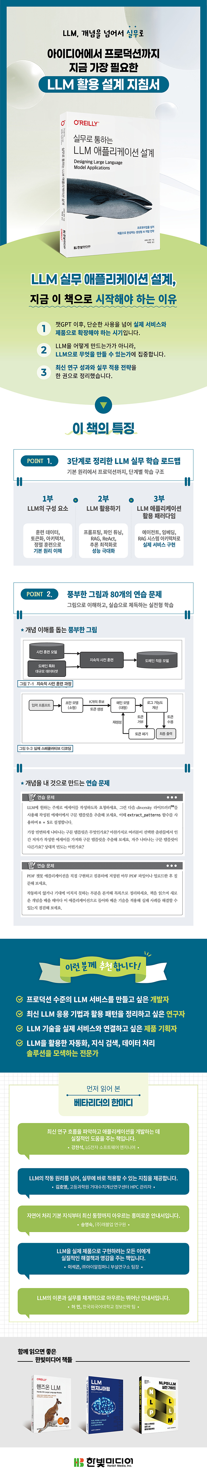 이 책은 LLM을 이해하고, 활용하고, 제품으로 구현하는 전 과정을 차근차근 밟아갈 수 있도록 안내합니다. LLM의 작동 원리를 직관적으로 이해하고, 프롬프트 설계와 파인 튜닝, RAG, 에이전트 아키텍처 등 최신 활용 기법을 익히며 실제 제품 환경에서 마주하는 문제와 한계를 해결하는 방법을 배울 수 있습니다. 특히 각 장마다 풍부한 실습과 연습 문제를 수록해 단순한 이론 학습을 넘어 직접 실험하며 체득할 수 있도록 구성했습니다. 소프트웨어 엔지니어, 머신러닝 연구자, 제품 관리자 모두가 이 책을 통해 LLM의 복잡한 퍼즐을 하나하나 맞춰 나갈 수 있을 것입니다. AI 시대에 경쟁력을 확보하려는 실무자에게 이 책은 아이디어를 실제 프로덕션으로 이어 주는 가장 실용적인 다리가 될 것입니다.
