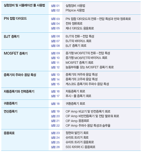 이 책은 전기·전자 관련 학과 학생들을 대상으로 하며, 이론에서 배운 전자회로의 특성과 동작을 시뮬레이션으로 예측하고 실험으로 확인해 볼 수 있는 실험 교재이다. 26개의 실험으로 구성되어 있으며, 총 48개의 회로를 통해 기초회로부터 응용회로까지 고루 실험해 볼 수 있다. 모든 실험은 [이론적 배경 이해] → [PSpice 시뮬레이션] → [실험 진행] → [실험 고찰]의 4단계를 거치며, 실험장비 및 PSpice 사용법을 상세하게 담아 실험을 처음 접하는 학생들도 쉽게 따라할 수 있게 했다.