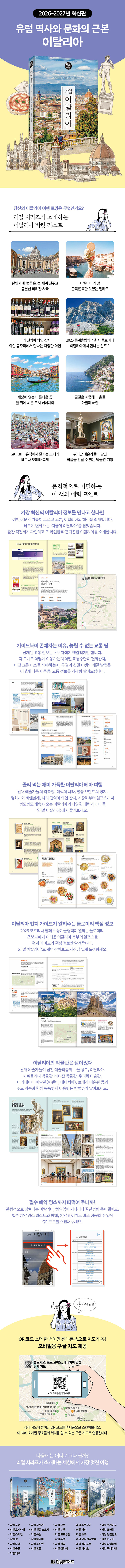 유럽 여행 여행의 끝판왕이라는 이탈리아의 이미지 때문일까, 코로나 19 이후, 이탈리아 전역은 어딜 가든 여행객으로 넘쳐난다. 유명 명소는 예약 없이는 입장이 불가능하거나 엄두도 못 낼 만큼 대기가 긴 경우도 많다. 그래서 『리얼 이탈리아』가 준비했다. 예약이 필수인 명소 리스트! QR 코드 스캔 한 번 이면 꼭 예약하고 가야 할 명소 리스트가 지역별로 한눈에 제시된다. 각 명소명을 누를 경우 공식 예약 사이트로 바로 연결되도록 편의를 제공한다. 필수 명소 리스트도 미리 알아두고, 예약까지 한 번에 진행하자.