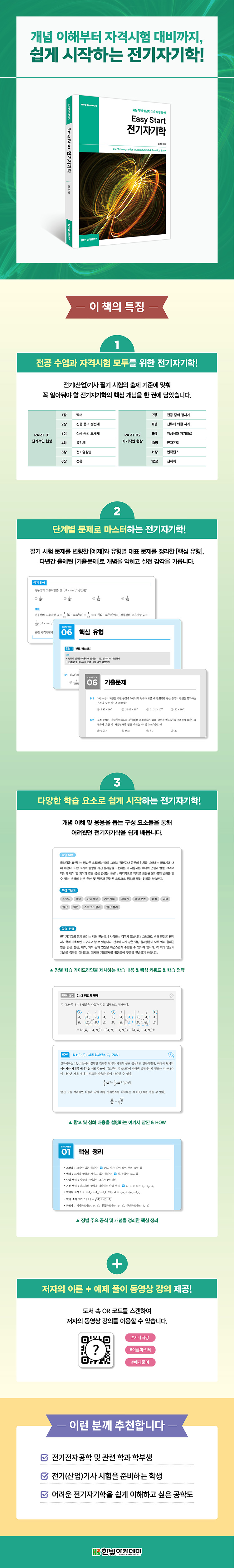 이 책은 전기·전자 계열 학부생과 전기(산업)기사 시험을 준비하는 학생들을 대상으로 한다. 어려운 전기자기학 과목을 쉽게 시작할 수 있도록 추상적이고 복잡한 이론 및 수식 전개는 가급적 배제하고, 꼭 알아야 하는 필수 개념 위주로 친절하게 설명했다. 또한 그림과 그래프를 활용하여 직관적인 이해를 돕고, 다양한 학습 요소를 통해 체계적으로 학습할 수 있게 했다.