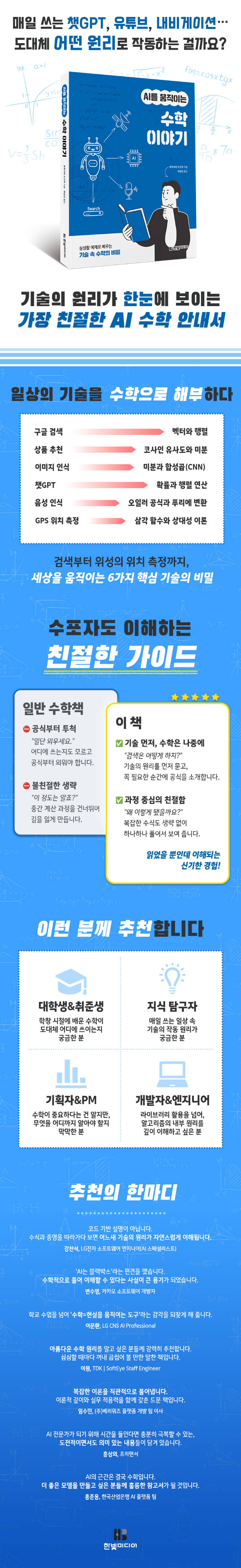 이 책은 학교에서 배우는 수학이 세상에 어떻게 쓰이는지 궁금한 학생들, 기술적 교양을 쌓고 싶은 모든 현대인, AI 기술의 원리를 깊이 있게 이해하고 싶은 개발자와 엔지니어, 기술의 가능성과 한계를 명확히 파악해야 하는 기획자와 경영진에게 강력히 추천합니다.