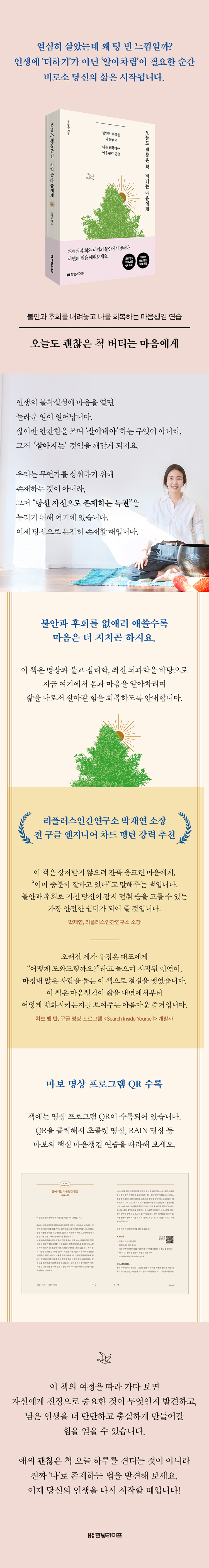 먼저 그 길을 걸어온 저자의 경험과 여러 사람들의 진솔한 이야기, 그리고 ‘초콜릿 명상’, ‘레인(RAIN) 명상’ 등 구체적인 마음챙김 연습법을 따라가다 보면, 지금 이 순간의 몸과 마음을 알아차리는 감각이 서서히 회복될 것이다. 각 장마다 소개되는 마음챙김 연습은 책에 수록된 QR 코드를 통해 실제로 따라 해볼 수 있다.