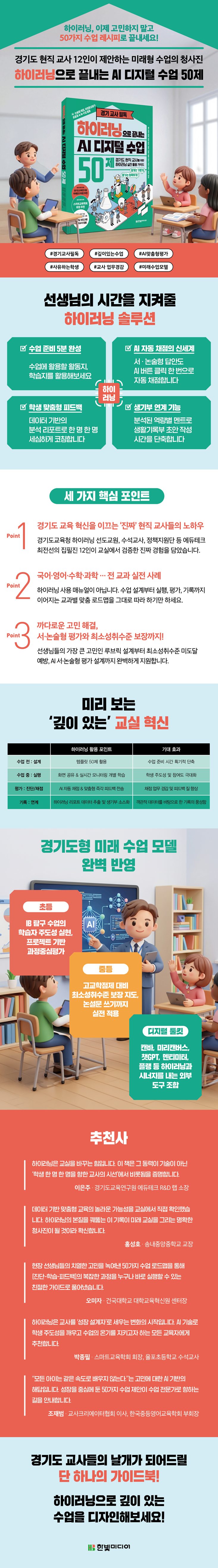 에듀테크 혁신을 이끄는 경기도 교육청 하이러닝 선도교원과 수석교사들이 직접 집필했습니다. 이론적인 설명에 그치지 않고, 교실 안에서 수많은 시행착오 끝에 찾아낸 '진짜 현장의 언어'로 하이러닝 활용의 해답을 제시합니다. 동료 교사의 시선에서 쓰인 이 책은 선생님의 수업 고민을 가장 시원하게 해결해줄 것입니다.
