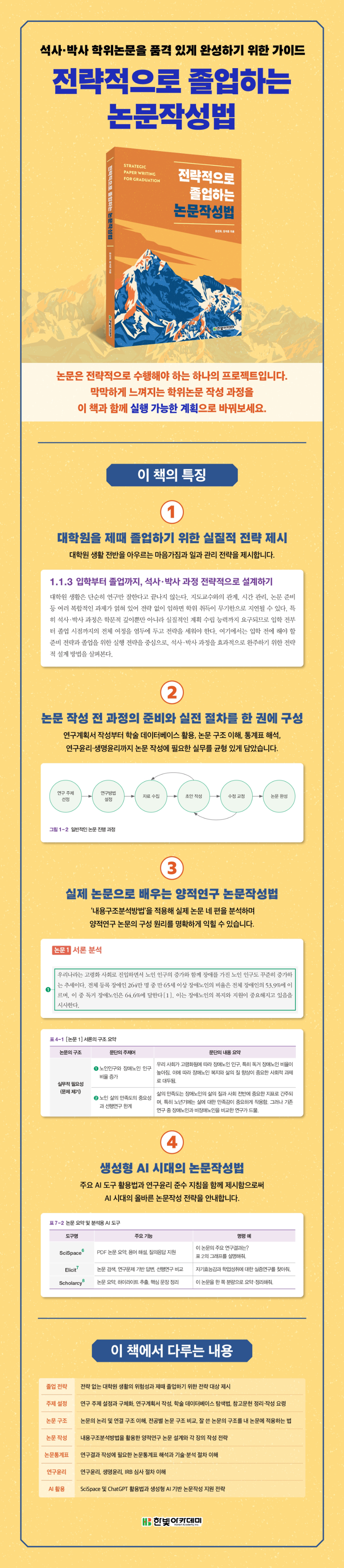 『전략적으로 졸업하는 논문작성법』은 단순히 논문 쓰는 법을 소개하는 책이 아닙니다. 저자진의 집필 과정과 지도 경험을 바탕으로, 연구자가 주제를 어떻게 탐색하고 논문의 구조를 세우며 완성해가는지를 입체적으로 보여줍니다. 저자진은 수년간 논문작성법과 연구설계를 지도하면서 많은 대학원생과 초보 연구자가 논문 집필 시 막히는 지점을 정확히 파악해 왔습니다. 이 책은 그 지점을 정면으로 다룹니다. 특히 4장은 실제 논문을 기반으로 양적연구 논문의 흐름과 구조를 시각적으로 보여주며 ‘논문은 이렇게 구성된다’를 독자가 체감할 수 있도록 구성했습니다. 더불어 7장에서는 생성형 AI 시대에 연구자가 무엇을 스스로 판단하고 어디까지 도구를 활용해야 할지에 대해 저자진의 실제 집필 사례와 경험적 기준을 공유함으로써, 기술의 편의성에 온전히 기대지 않고 연구자가 중심을 잃지 않는 글쓰기 전략을 제시합니다. 논문이라는 장기 프로젝트를 이끌 때 실질적인 지침이 필요한 독자에게 이 책은 막연함을 전략으로 전환하는 데 필요한 통찰을 제공할 것입니다.