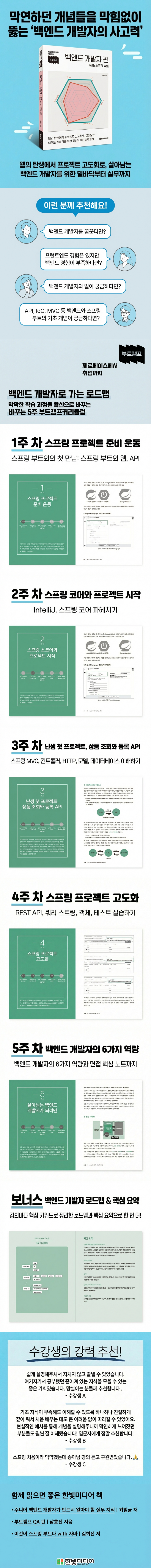 이 책은 지식을 전달하지 않습니다. 정확히 말하면 ‘지식을 진짜 내 것으로 만드는 방법’을 알려 줍니다. 특정 기술의 사용법보다 더 중요한 건 그 기술을 나만의 언어로 설명할 수 있는 사고력, 즉 학습 능력입니다. 이 책을 펼쳤다면 우리는 어노테이션 하나, 설계 구조 하나도 그냥 넘어가지 않을 것입니다. 먼저 직접 구현해보고, 몸으로 불편함을 겪어보고, 그 다음에 ‘아, 이래서 스프링이 필요한 거였구나!’하고 깨닫게 될 것입니다. 익숙한 코드가 아니라, 낯설지만 생각하게 만드는 코드로 성장하는 경험을 하게 될 거예요.