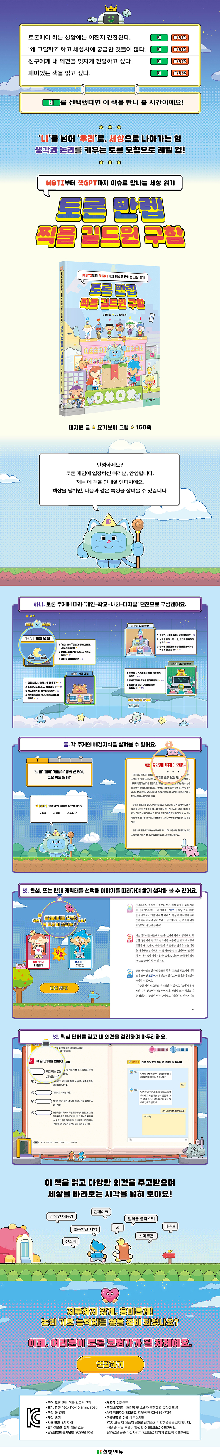 ‘토론’이라는 것이 조금 어렵게 느껴질 수도 있지만, 이 책은 아이들이 좋아하는 게임 형식을 차용해 일상에서 마주하는 최신 이슈를 담았기 때문에 책의 구성을 따라간다면 누구나 쉽게 깊이 사고하는 힘을 기를 수 있습니다.