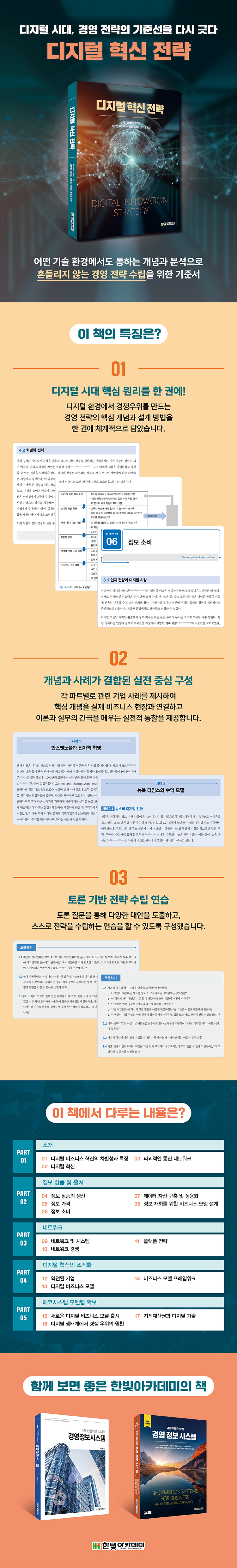 ‘디지털 혁신 전략’으로 번역된 이 책은 급변하는 디지털 시대에 기업이 어떻게 혁신을 이어가야 생존할 수 있는지에 대한 방향을 제시한다. 특히, 끊임없이 등장하는 혹은 등장할 새로운 기술에 집착하기보다는 그런 신기술이 경영에 적용되었을 때 나타나는 혹은 나타날 경제·경영 원리에 바탕을 두고 디지털 혁신 전략을 수립할 수 있도록 함으로써 어떠한 기술이 등장하더라도 학생들이 응용할 수 있는 기본 개념에 대한 이해와 적용 능력을 향상시킨다. 각 장마다 제시된 토론 질문은 거꾸로 학습 방법 수업을 진행하는 데 큰 도움이 되고, 논문 기반의 추천문헌은 학습자의 개념 이해를 심화하는 데 기여하며 대학원생 대상의 심화학습에 활용할 수 있다. 또한 이 책에 수록된 5개의 사례는 본문에서 배운 개념이 실제 산업 현장에서 어떻게 적용되는지를 보여주며, 토론 질문을 통해 대안을 도출하고 전략을 수립하는 연습을 할 수 있도록 구성되었다. 사례들은 주로 정보재 중심의 서비스 산업을 다루지만 디지털 전환이 확산되는 오늘날에는 거의 모든 산업에 시사점을 제공한다. 따라서 이 책은 학부 고학년생, MBA 및 MS 학위를 추구하는 대학원생은 물론 실무진에게도 유용한 통찰력을 제시한다.