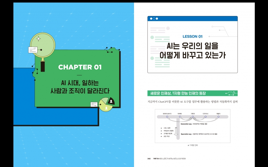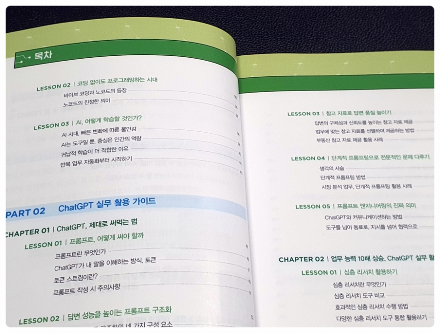 본 도서는 크게 4개의 파트로 구성되어 있다. 파트2까지는 각종 프롬프팅 기법과 GPTs 기반의 업무 자동화를 포함하여 챗GPT를 사용하여 업무 능력을 향상하는 방법에 대한 이야기를 담고 있으며, 파트3은 노코드 기법을 통한 업무 자동화 사례, 그리고 마지막 파트4는 AI 시대를 살아가는 우리들의 자세와 방향성에 대한 조언을 담고 있다.
