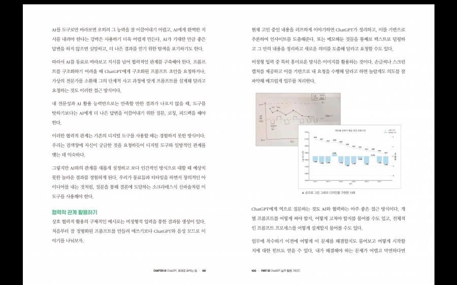 모쪼록 본 도서를 통해 챗GPT를 보다 더 생산적으로 활용하는 경험을 갖고, 이러한 과정을 통해 업무 생산성을 올리고 개인적인 역량 개발에도 도움이 되었으면 좋겠다. 무엇보다 나를 포함한 많은 직장인들이 개인으로서 여러 가지 기회를 만드는 계기가 되었으면 한다.