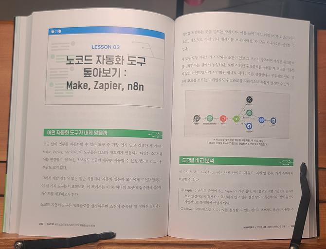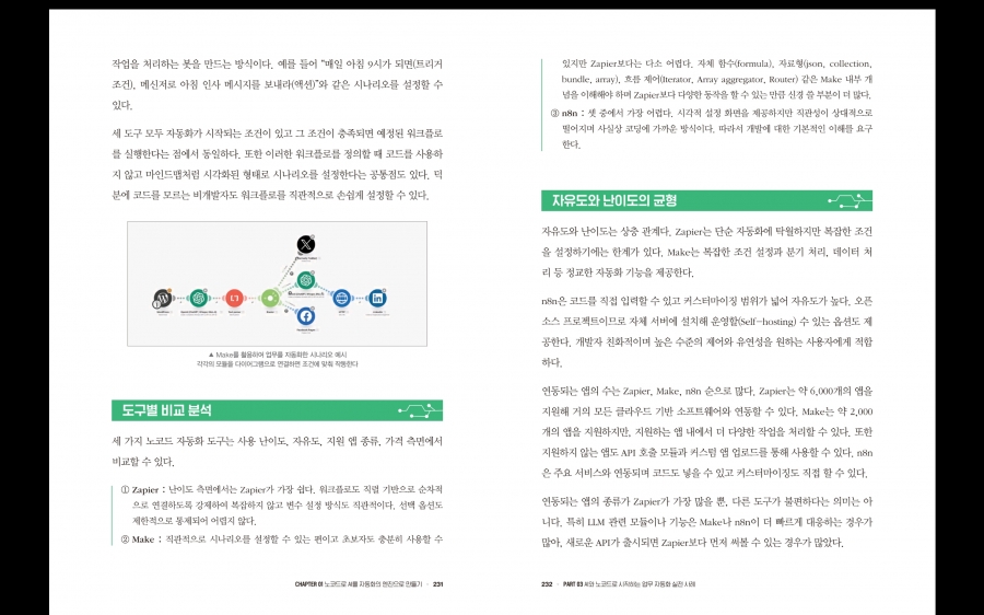 파트1과 파트2도 물론 내용이 좋았지만, 사실 챗GPT에 대한 경험이 좀 있는 편이어서, 개인적으로는 파트3과 파트4의 내용을 흥미있게 읽었던 것 같다. 노코드 도구의 경우는 주로 Make 서비스를 사용하여 자동화 시나리오를 만드는 실습을 다루고 있다. 개인적으로 Zapier는 좀 써봤었는데, Make는 그보다 좀 더 복잡한 조건을 설정하는데 유용하는 느낌을 받았고, 가격도 Zapier보다 저렴하기 때문에 외부 AI 서비스 사용에 개방적인 업체들에서는 업무 자동화에 활용할만한 할 것 같다. 참고로, n8n은 오픈소스라 자체 셀프 호스팅 환경을 구축하여 사용할 수도 있다고 하는데, 어짜피 서버 비용은 또 들기 때문에, 그냥 맘편히 Make를 쓰는게 나을지도..