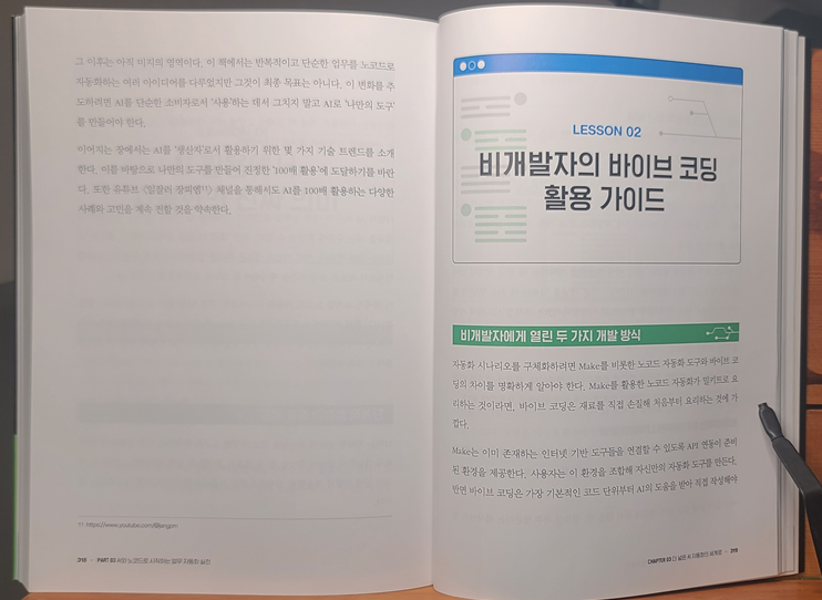 또한, 요즘 핫한 바이브 코딩과 MCP에 대한 내용도 다루고 있다. 본 도서에서는 Make와 MCP를 연동하는 실습을 진행하고 있는데, Claude MCP의 경우 유료 버전을 사용해야만 실습을 진행할 수 있다. 요새 AI 서비스를 보통 1~2개씩은 유료구독하고 있는 상황이라 이제는 유료를 구독하여 적극 사용해보는 것이 좋을 것 같다.