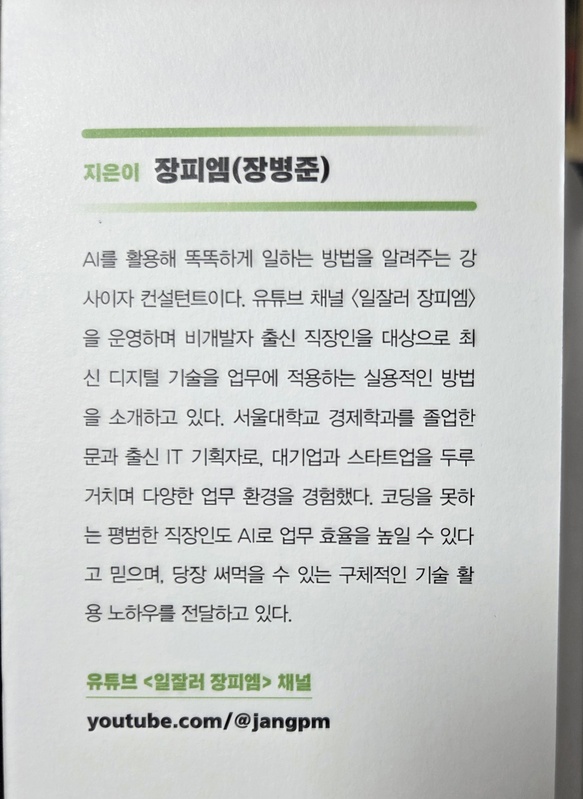 장피엠 저자의 실무 노하우가 가득 담긴 이 책을 통해, 여러분도 'AI 시대의 진짜 일잘러'가 되어보세요!