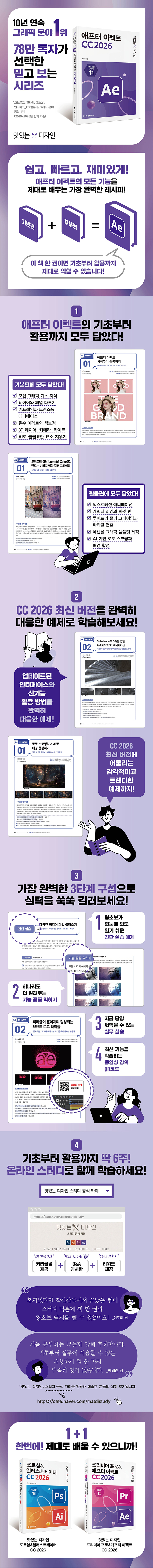 또한 가장 최신 버전인 CC 2026에 완벽히 대응하여 AI를 활용한 최신 기능을 학습할 수 있습니다. 어려운 예제는 저자의 친절하고 쉬운 강의를 통해 보다 자세히 이해할 수 있습니다. 애프터 이펙트를 완벽하게 마스터할 수 있는 3단계 학습 방법인 [기능 실습], [동영상 강의], [실무 실습]의 구성으로 누구나 애프터 이펙트를 쉽게 제대로 써먹을 수 있습니다.