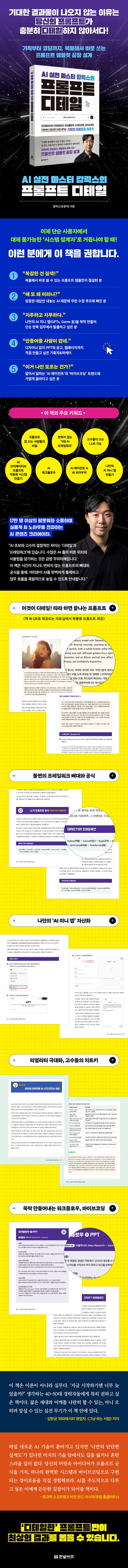 더 이상 남이 만든 프롬프트를 복사해 쓰지 말자. 복잡한 코딩 지식이 없어도 이 책 속의 디테일한 지시를 따라 하다 보면, 업무를 넘어 일상생활에서도 AI를 완벽하게 활용할 수 있다. AI 초보자도 단숨에 상위 1%로 도약하는 압도적 생산성의 차이! 그 비밀은 ‘디테일’에 있다.