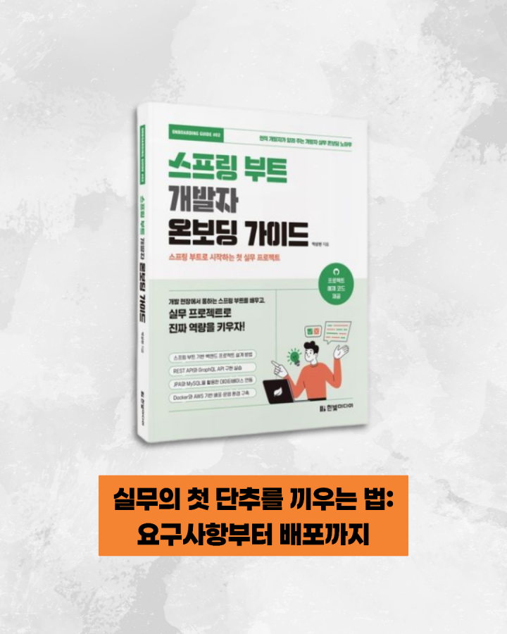 스프링 부트 개발자 온보딩 가이드는 제목 그대로 '온보딩 문서'처럼 구성된 스프링 부트 실무 입문서예요. 개발 환경 구축부터 AWS 배포까지, 하나의 프로젝트를 처음부터 끝까지 만들어가는 과정을 따라가며 배우는 구조입니다.