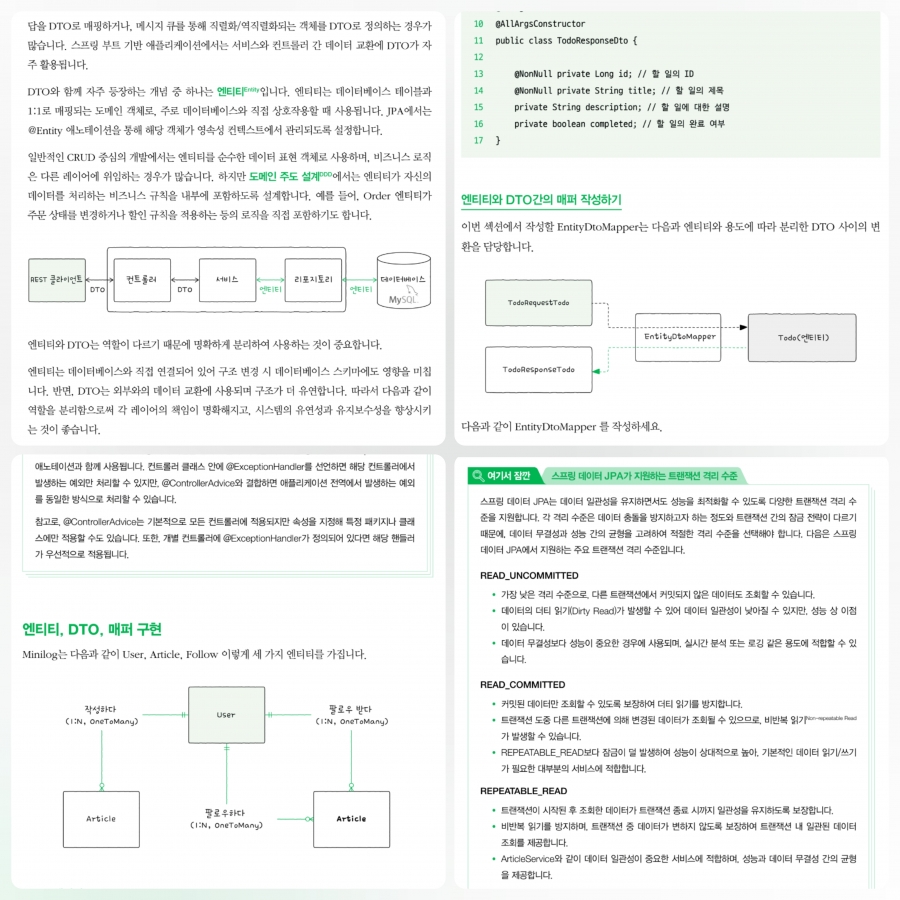 이 책을 읽고 나서 자바/스프링 진영에 대한 막연함이 많이 걷혔어요. 개발 커뮤니티에서 "스프링 시큐리티가...", "JPA N+1 문제가..." 하는 대화가 나와도 이제는 무슨 맥락인지 이해할 수 있게 됐습니다.