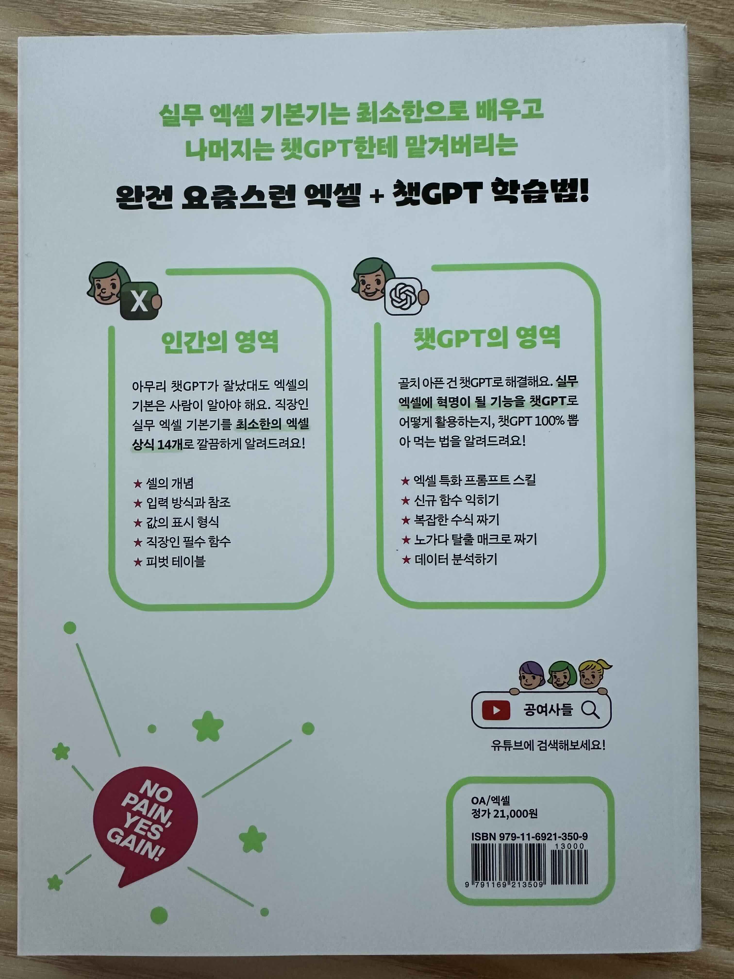 혼란스러운 AI 시대에서, 어디까지가 인간이 알아야 하는 영역이고, 어디까지가 챗GPT와 같은 도구를 활용해야 하는지 혼란스러울 수 있다. 하지만 이 책에서는 엑셀의 기본적인 내용은 사람이 해야 하는 영역으로, 나머지 어려운 문제는 챗GPT가 도와줄 영역으로 확실히 구분한다.