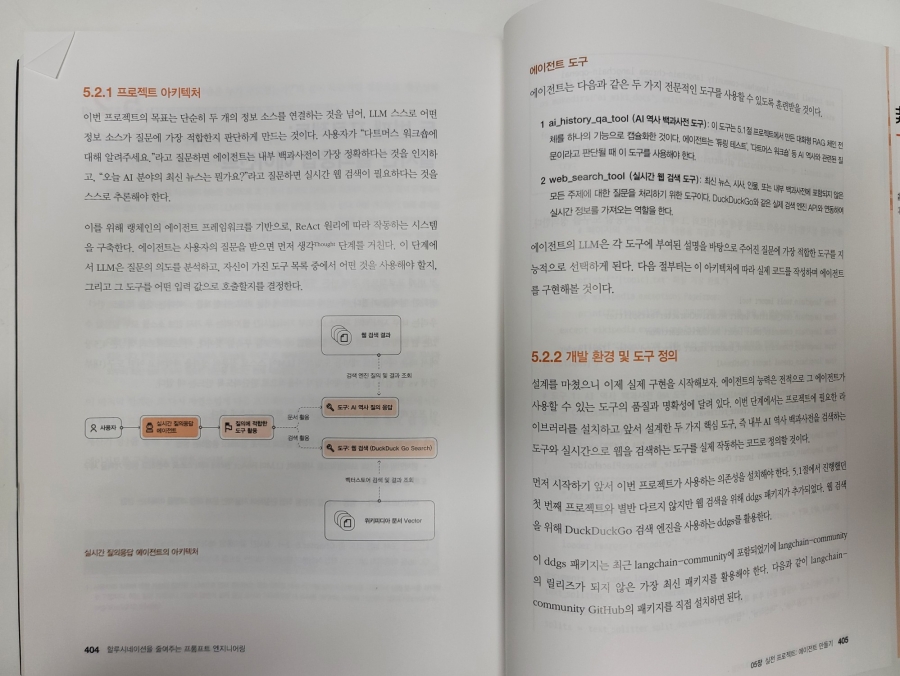 5장 프로젝트 세 개가 이 책의 하이라이트다. 백과사전 챗봇, 실시간 Q&A 에이전트, 주식 트렌드 분석 에이전트. 앞에서 배운 개념들을 여기서 다 써먹는다. 주식 트렌드 분석 에이전트가 제일 흥미로웠다. 실시간 뉴스 수집하고, 여러 소스 통합하고, 신뢰성 검증하고, 최종 분석 리포트 만드는 전 과정을 구현한다. 단순한 튜토리얼이 아니라 실제 서비스 수준의 고민들(에러 처리, 타임아웃, API 제한, 결과 검증 등)이 다 들어가 있다. 물론 따라하는 게 쉽진 않다. 특히 API 키 여러 개 필요하고, 환경 세팅도 복잡하고. 그래도 끝까지 완성하고 나면 '내가 AI 에이전트를 만들었다'는 성취감이 있다. 그리고 이걸 기반으로 내 아이디어를 추가해볼 수 있겠다는 자신감도 생긴다.