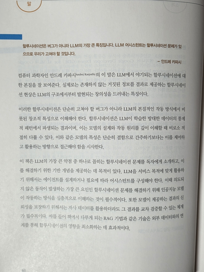 대상 독자 책에서 제시하는 대상 독자는 다음과 같습니다. 1. 실제 비즈니스 환경에서 신뢰할 수 있는 AI 서비스 구축을 담당하는 개발팀 2. LLM의 신뢰성과 정확성 향상에 관심이 높은 AI 엔지니어 및 MLOps 전문가 3. 파이썬 프로그래밍과 기본적인 머신러닝 지식을 바탕으로 LLM 활용 역량을 심화하고자 하는 전문가 4. 데이터 분석 경험을 바탕으로 LLM을 활용한 고급 분석 기법을 학습하고자 하는 실무자 LLM을 공부하거나 AI Agent를 개발하거나 실습하다 보면 할루시네이션을 경험하게 되고, 그 문제의 해결 방법에 대해 고민하게 됩니다. 저도 이 문제 때문에 이 책을 선택하여 읽게 되었는데, 그때가 이 책을 읽는 가장 좋은 시점이 될 것입니다. 할루시네이션에 대한 다양한 내용과 해결 방법, 마지막 프로젝트를 통해 실질적인 해결 방식을 흥미롭게 학습할 수 있습니다. 조금 어려운 내용의 책이기는 합니다. 하지만 LLM과 AI Agent를 공부하면서 마주쳤던 할루시네이션을 해결하는 방법을 이 책을 통해 학습할 수 있어서 좋았습니다.