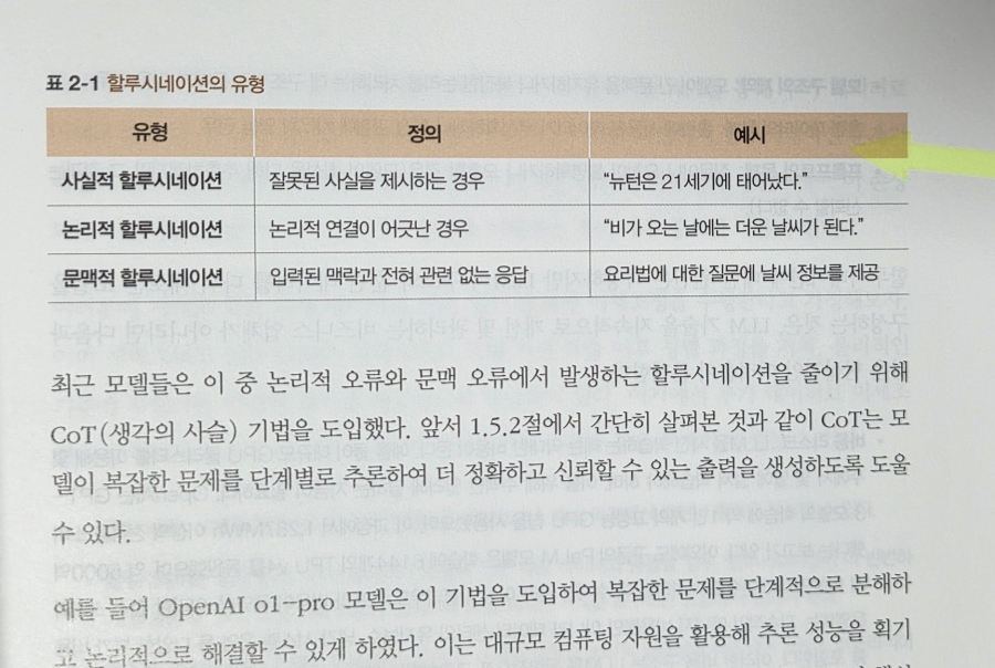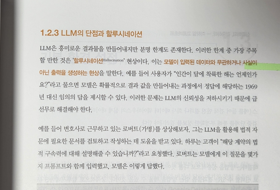 책은 먼저 할루시네이션을 사실적·논리적·문맥적 세 가지로 나누어 설명한다. 사실적 할루시네이션은 수치나 날짜 같은 사실을 틀리게 제시하는 경우, 논리적 할루시네이션은 추론 과정이 비약하거나 모순되는 경우, 문맥적 할루시네이션은 질문과 무관한 답을 하는 경우다. 결국 LLM의 답변은 항상 검증되어야 하며, 신뢰할 수 있는 데이터와 정교한 프롬프트 설계가 필수라는 메시지를 분명히 한다.