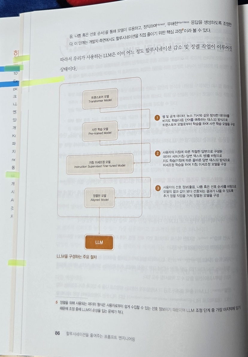이어 LLM이 실제로 구축되는 과정을 트랜스포머 모델, 사전 학습, 지침 미세조정(Instruction FT), 정렬(Aligned)이라는 단계로 풀어준다. 우리가 사용하는 상용 모델은 이미 일정 수준의 정렬이 되어 있지만, 서비스 품질을 높이려면 여기에 프롬프트 설계와 검증 절차가 덧붙어야 한다고 설명한다.