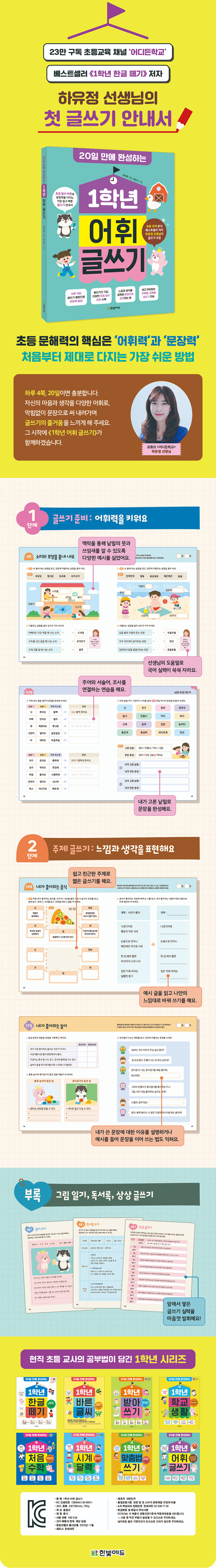 저자 하유정 선생님은 초등 교실에서 오랜 시간 국어를 지도해 왔습니다. 아이들이 한글을 떼고, 받아쓰기로 기초를 다진 다음에는 ‘어떻게 하면 자신의 생각을 막힘없이 표현하게 할 수 있을까?’를 고민했습니다. 저자는 결국 아이들에게 부족한 것은 생각이 아니라 생각을 담아낼 ‘어휘’이고, 그 어휘를 문장으로 연결하는 ‘글쓰기 기술’이라는 결론을 내렸습니다. 《1학년 어휘 글쓰기》의 1단계가 어휘력을 키우는 내용으로 구성된 이유입니다.