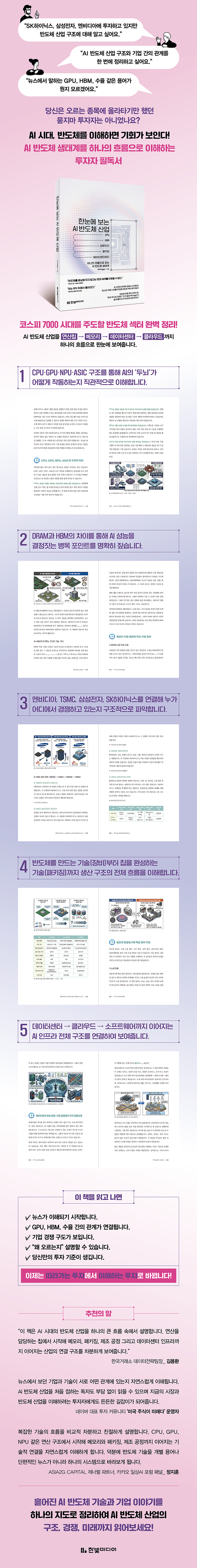 코스피 열풍과 글로벌 증시를 이끄는 중심에는 AI 반도체 산업이 있습니다. 엔비디아, TSMC, 삼성전자, SK하이닉스 같은 이름은 익숙하지만 이들이 어떤 구조로 연결되어 산업이 움직이는지는 쉽게 보이지 않습니다. 이 책은 연산칩(GPU), 메모리, 패키징, 파운드리, 장비를 거쳐 데이터센터, 클라우드 그리고 최종 도착지인 소프트웨어까지 이어지는 밸류체인을 따라가며 AI 반도체 산업을 하나의 거대한 생태계로 정리합니다. 왜 AI 시대의 중심이 GPU로 이동했는지, 왜 성능의 병목이 메모리로 넘어갔는지, 왜 HBM과 패키징 기술이 중요해졌는지를 큰 그림 안에서 이해할 수 있도록 돕습니다. 또한 데이터센터와 클라우드를 포함한 인프라 관점에서 기업과 기술이 어떻게 연결되어 있는지를 보여주며, AI 반도체 산업 전체를 입체적으로 바라보는 시각을 제공합니다. 이 책은 단순한 기술 설명이나 기업 소개를 넘어 AI 반도체 산업의 큰 흐름을 정리하고 싶은 독자에게 현실적인 출발점이 되어 줄 것입니다.