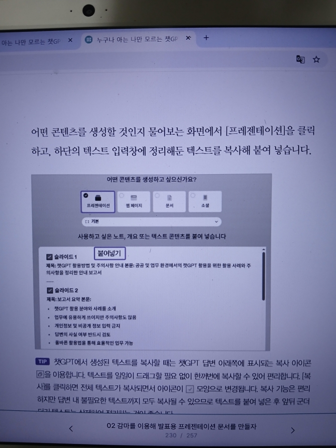 생성형 AI로 할 수 있는 여러가지 중에서 음악 만들기, 이미지 생성, 동영상 만들기, 파워포인트 장표 만들기 등이 가장 궁금했는데, 그 중에서 파워포인트 장표 만들기는 마침 제안서 작업이 필요한 부분이 있어 직접 책의 내용을 참고해서 업무에 적용해 보았다.