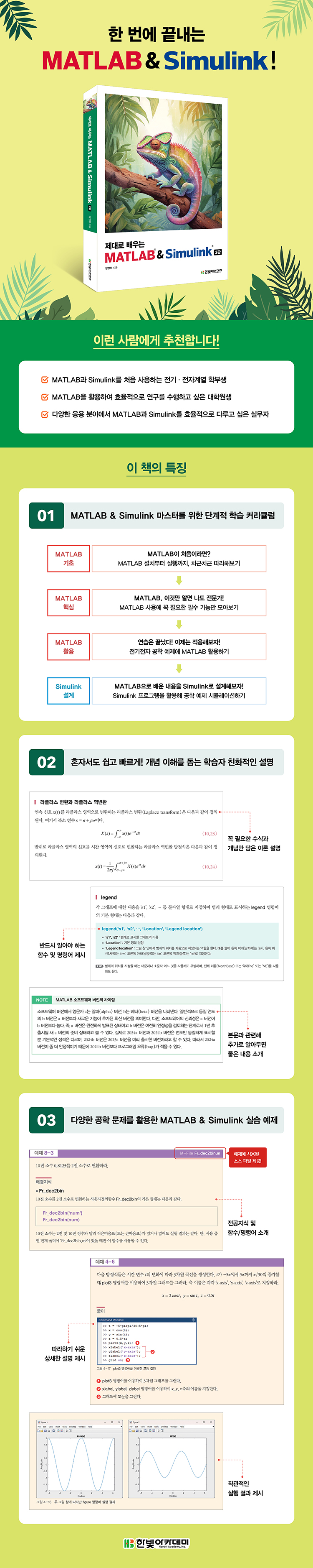 이 책은 미국 매스웍스(MathWorks)에서 개발한 고급 테크니컬 프로그래밍 언어인 MATLAB과 이를 기반으로 한 블록 다이어그램 환경인 Simulink를 다루는 법을 핵심적인 기능 위주로 설명하는 도서입니다. MATLAB과 Simulink을 설치하는 기초적인 방법부터 제어, 신호 및 시스템, 회로, 인공지능 등의 다양한 공학 예제에 접목할 수 있는 응용 방법까지 폭넓게 다룹니다. 직접 따라해볼 수 있는 상세한 풀이 방법 및 소스 파일을 제공하여 부담없이 MATLAB과 Simulink를 학습할 수 있도록 지원합니다.