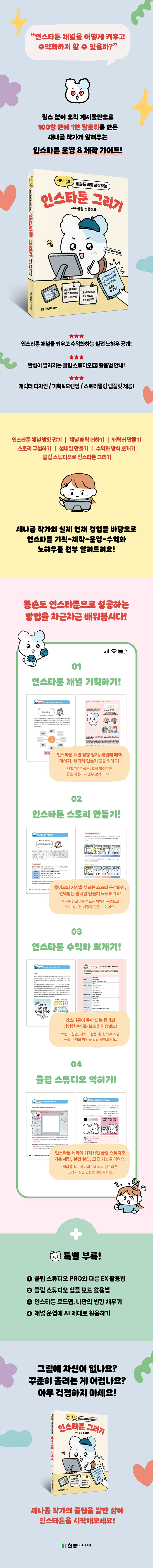 인스타툰의 핵심인 채널 기획부터 매력적인 캐릭터 설정, 클릭과 팔로우를 부르는 스토리 만들기, 다양한 인스타툰 수익화 방법 등을 가감 없이 공개합니다. 또한, 인스타툰 그리기에 최적화된 도구인 클립 스튜디오의 핵심 기능을 콕 집어 설명하며, 인스타툰 제작을 위한 실전 실습까지 포함했습니다.