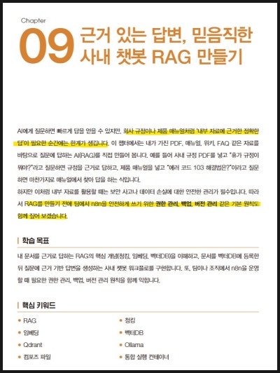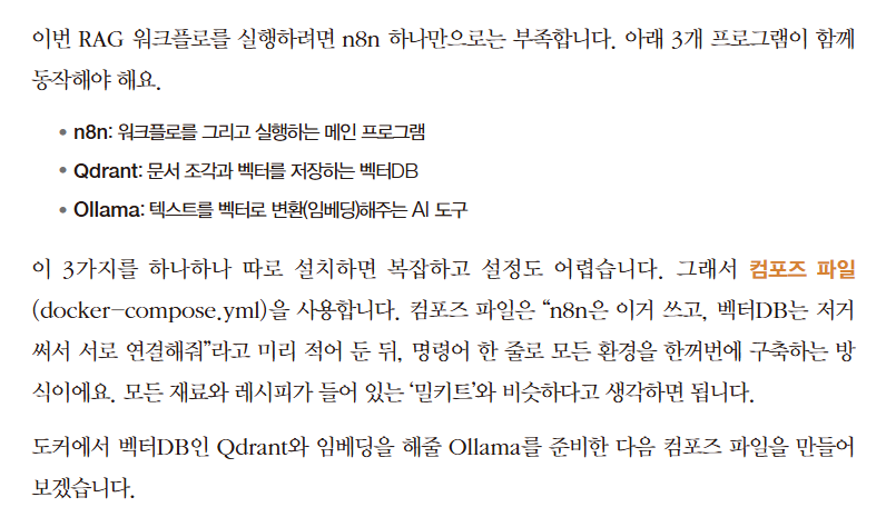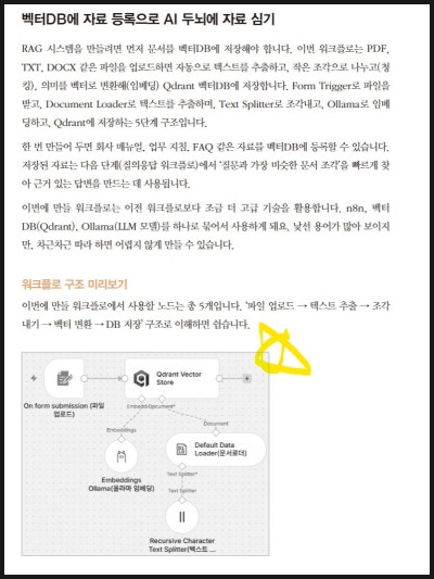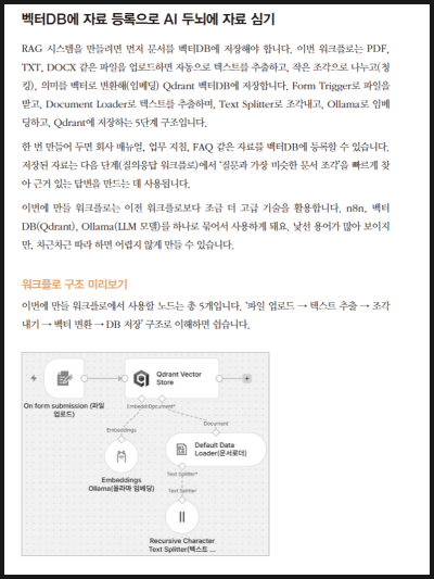 책에서는 이런 개념을 너무 이론적으로만 설명하지 않고, n8n 안에서 어떻게 구성할 수 있는지를 실습 중심으로 보여준다. Qdrant, Ollama, 워크플로 구성 등 처음 보면 낯선 요소들이 있지만, 단계별로 따라가면서 “아, 이렇게 자료를 넣고 검색해서 답변하는 구조를 만들 수 있구나”를 이해할 수 있었다.
