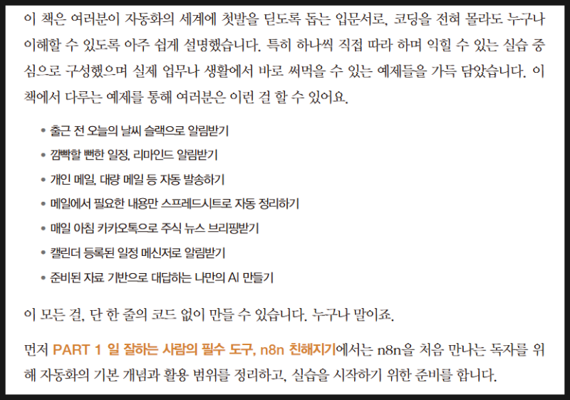 반복 업무를 줄이고 싶고, AI 자동화를 직접 만들어보고 싶다면 이 책은 좋은 출발점이 될 수 있는 책이다.