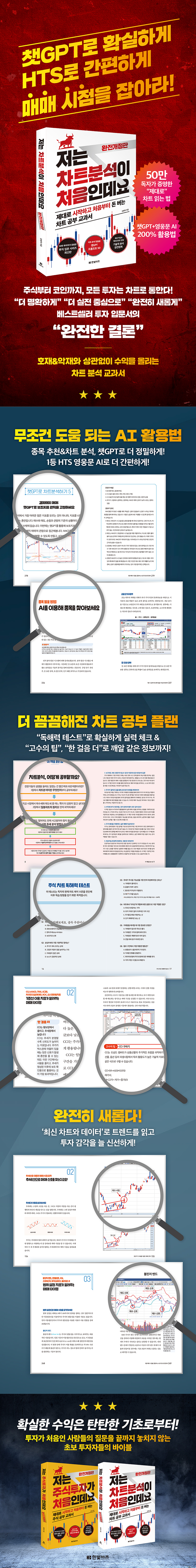 차트를 읽는다는 것은 시장의 심리와 흐름을 읽는다는 뜻입니다. 그리고 그 기준을 갖는 순간, 투자는 더 이상 ‘감’에 기대는 행동이 아니라 스스로 결정하는 과정이 됩니다. 《저는 차트분석이 처음인데요 완전개정판》은 복잡한 지표에 대한 꼼꼼한 설명뿐만 아니라, 무엇을 먼저 보고 어떤 순서로 해석해야 하는지 우선순위까지 따박따박 설계해줍니다. 여기에 챗GPT를 활용한 차트 점검 가이드를 더해, 혼자서도 질문하고 판단을 정리하는 방법까지 안내합니다.
