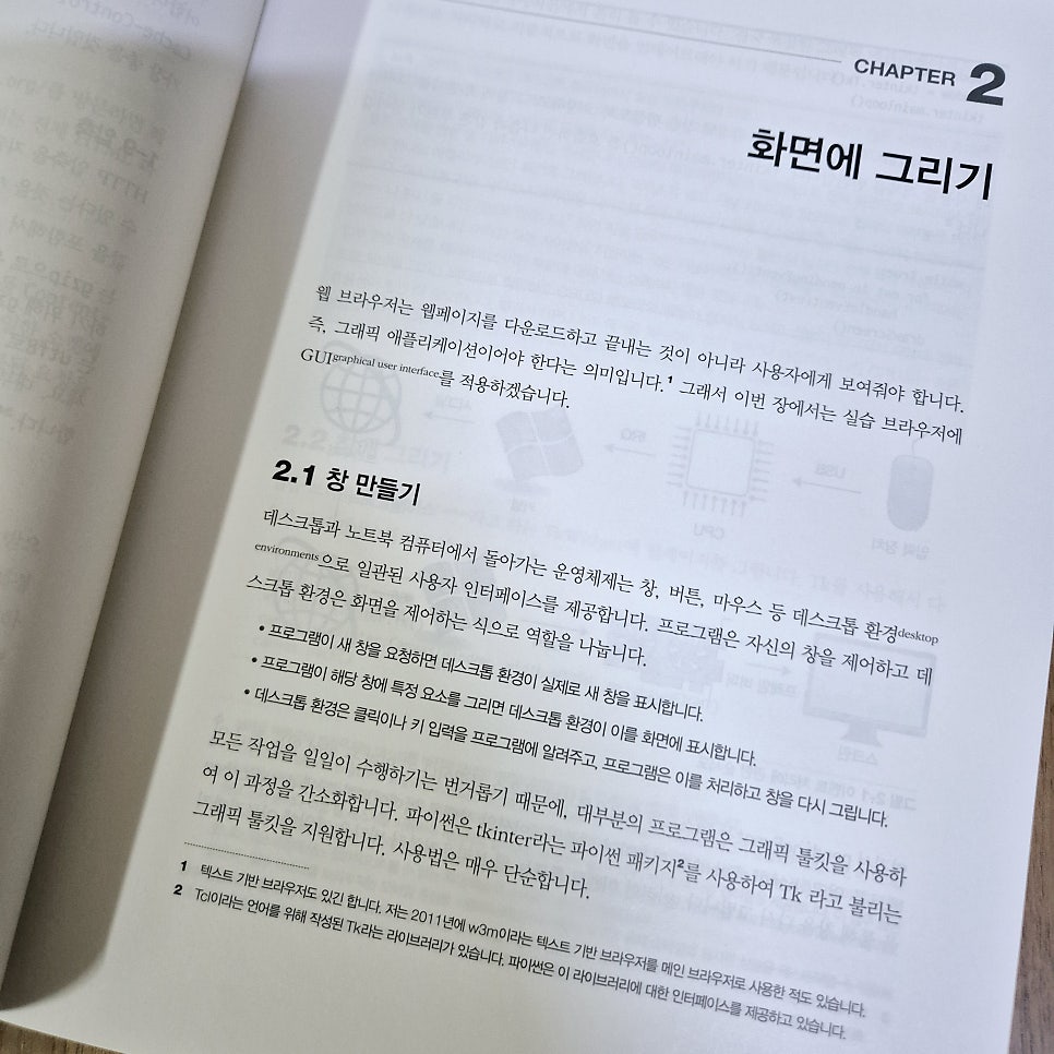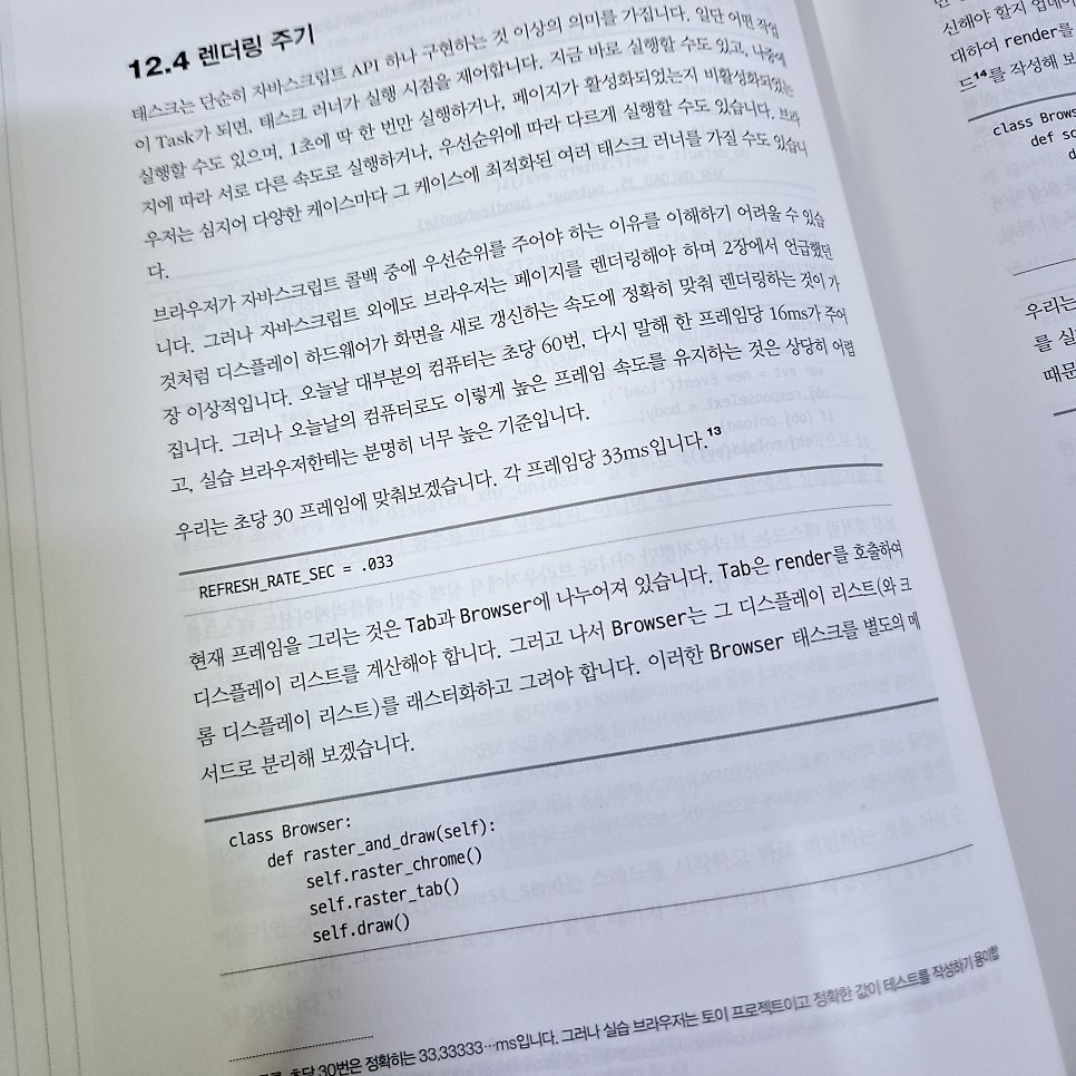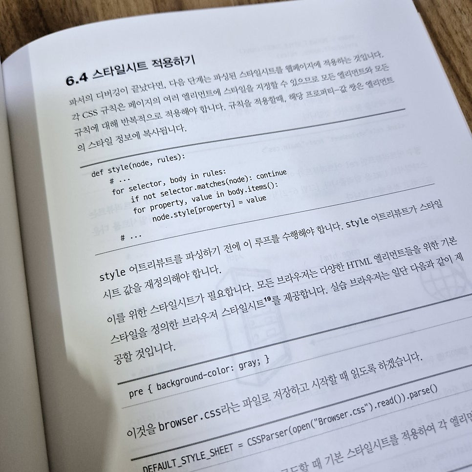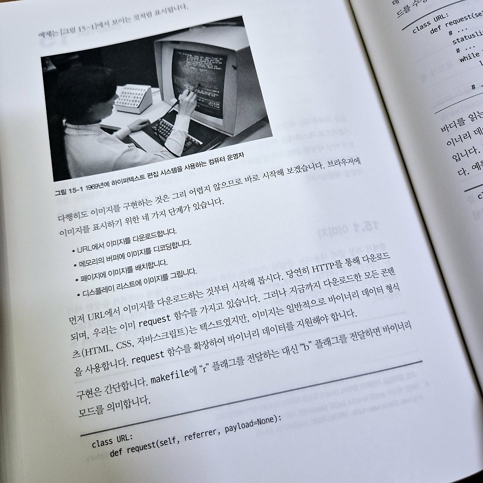 그만큼 브라우저는 가까이에 있어 왔고, 이런 이유로 V8 엔진이니, 주소창에 URL을 때려 넣고 난 이후의 순서니, 브라우저의 근간이 되는 기술에 대해 읽어가며 익히기도 했다. 달리 말해 그런 과정이 피상적으로 느껴지기도 했던 건 읽을 때는 이해가 되지만 시간이 지나면 금세 잊곤 했기 때문이다. 이 책은 그 점에서 명확히 다르다. ‘브라우저를 직접 만들어본다’는 경험 자체가 추상적인 개념을 직접 체화할 수 있도록 만든다. 개발자가 되고 싶다면 자기가 만들고 싶은 걸 만들어보라는 말처럼, 이건 단순히 글로 접하는 피상적인 지식이 아니라 그 근간을 파헤쳐 보고 전체 흐름을 몸으로 익혀보라는 의미처럼 느껴졌다.