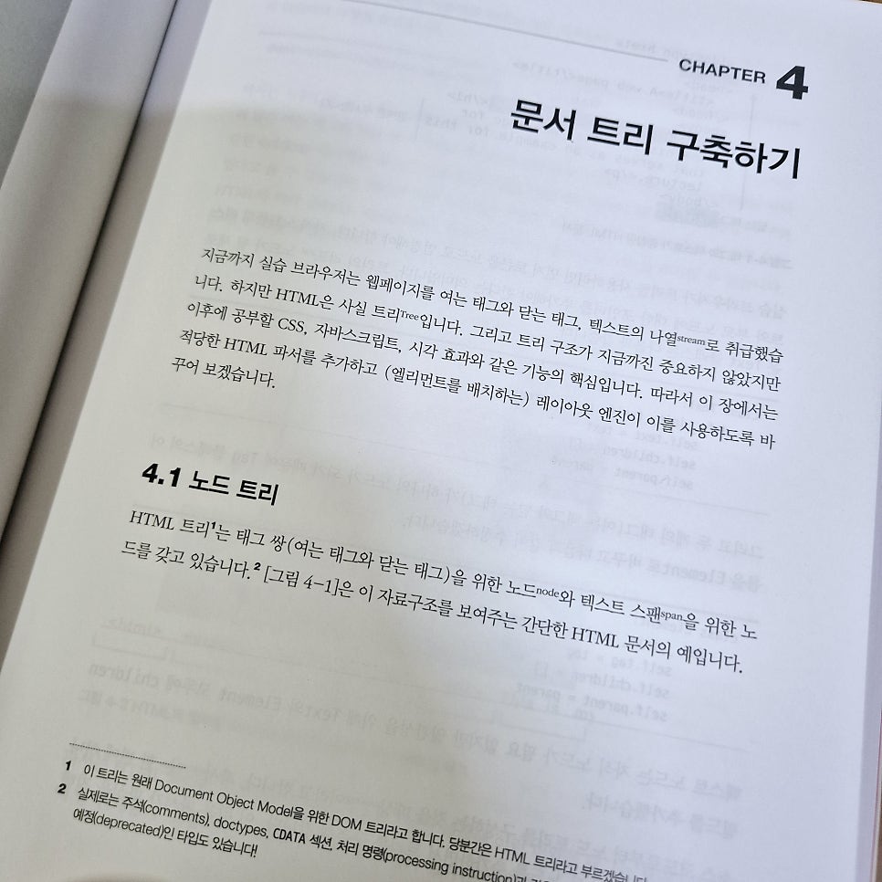 화면을 그려내는 챕터에 들어서는 특히 Canvas API를 다뤄본 사람이라면 익숙하게 느낄 수 있는데, 축에 대한 정보를 주고 그려내는 방식이 꽤나 닮아 있었다. 파서를 만들어 문서 트리를 구축하고, 이를 통해 노드 트리를 사용하는 과정을 보면서, 웹에디터와 같은 기능을 구현하는 도메인의 회사라면 이 책이 특히 도움이 될 것 같다는 생각이 들었다.